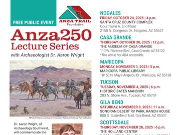 The Anza Trail Foundation invites you to a special lecture with Dr. Aaron Wright of Archaeology Southwest on Friday, October 24, 2025, at 4:00 p.m. at the Santa Cruz County Complex in Nogales.