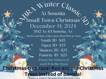 The SABRA Winter Classic 5D is coming to Sonoita Small Town Christmas on Saturday, December 13th! Riders will compete in a festive twist on barrel racing running around Christmas trees instead of barrels.